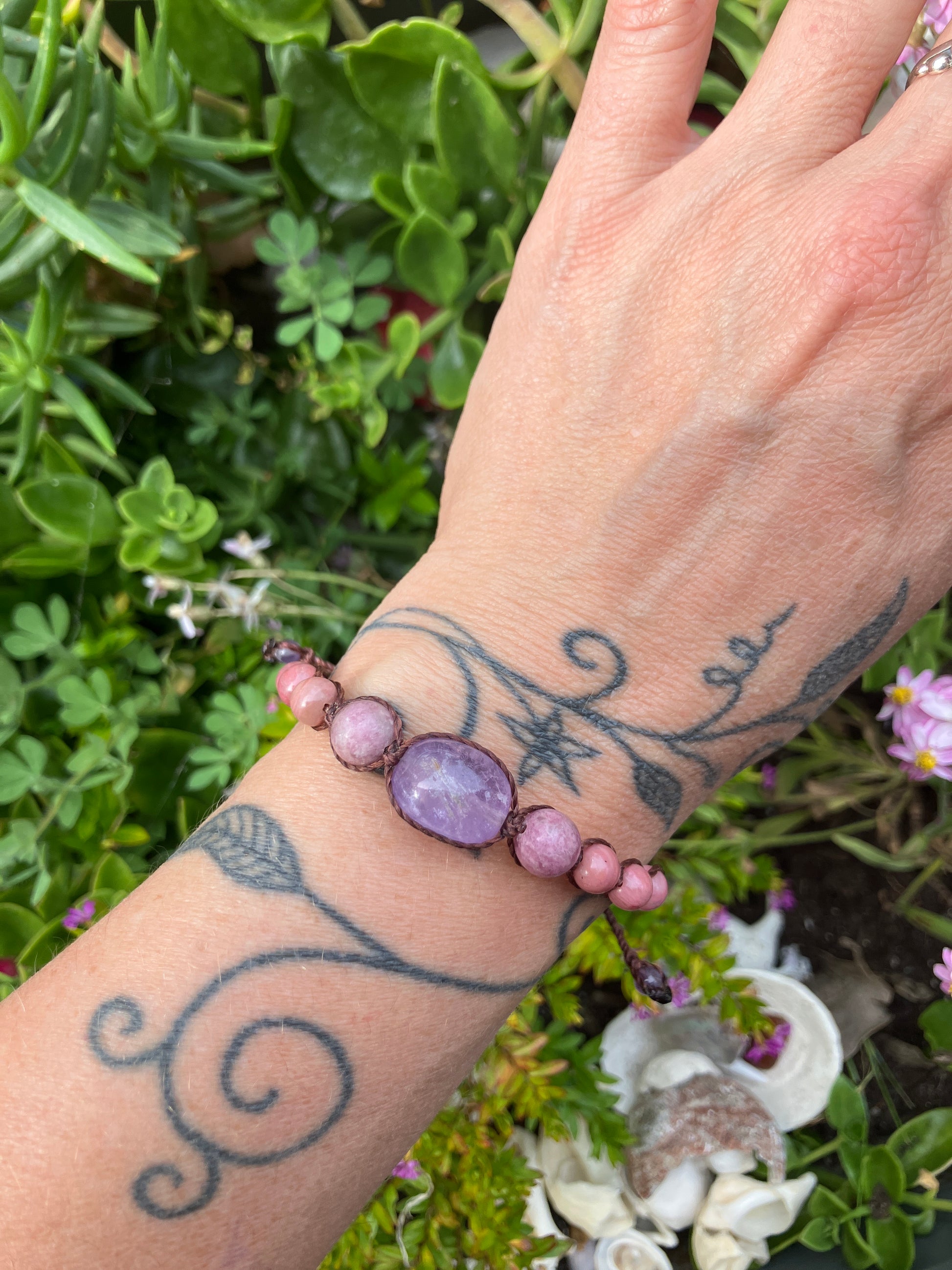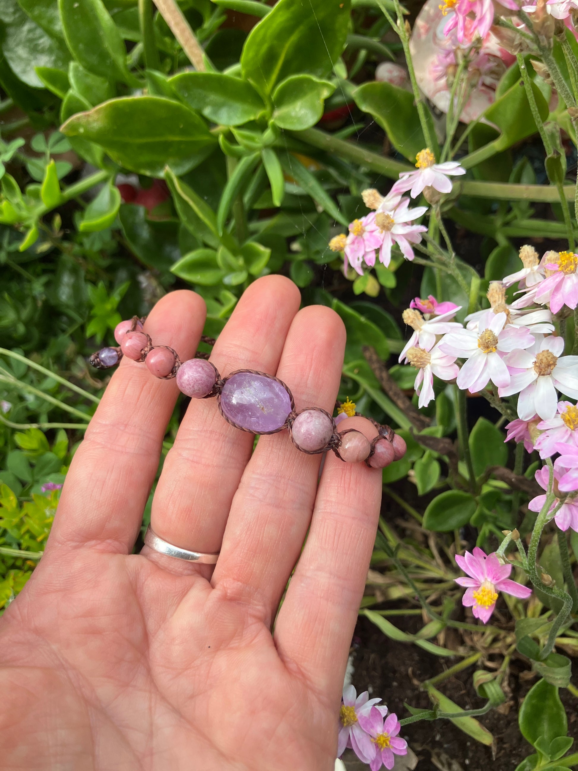 This macrame bracelet has been made with a beautiful soft lavender’s Amethyst with Lepidolite & Rhodonite this bracelet has been woven with the intention to bring peace, connection to the divine and for compassion & self forgiveness 💗