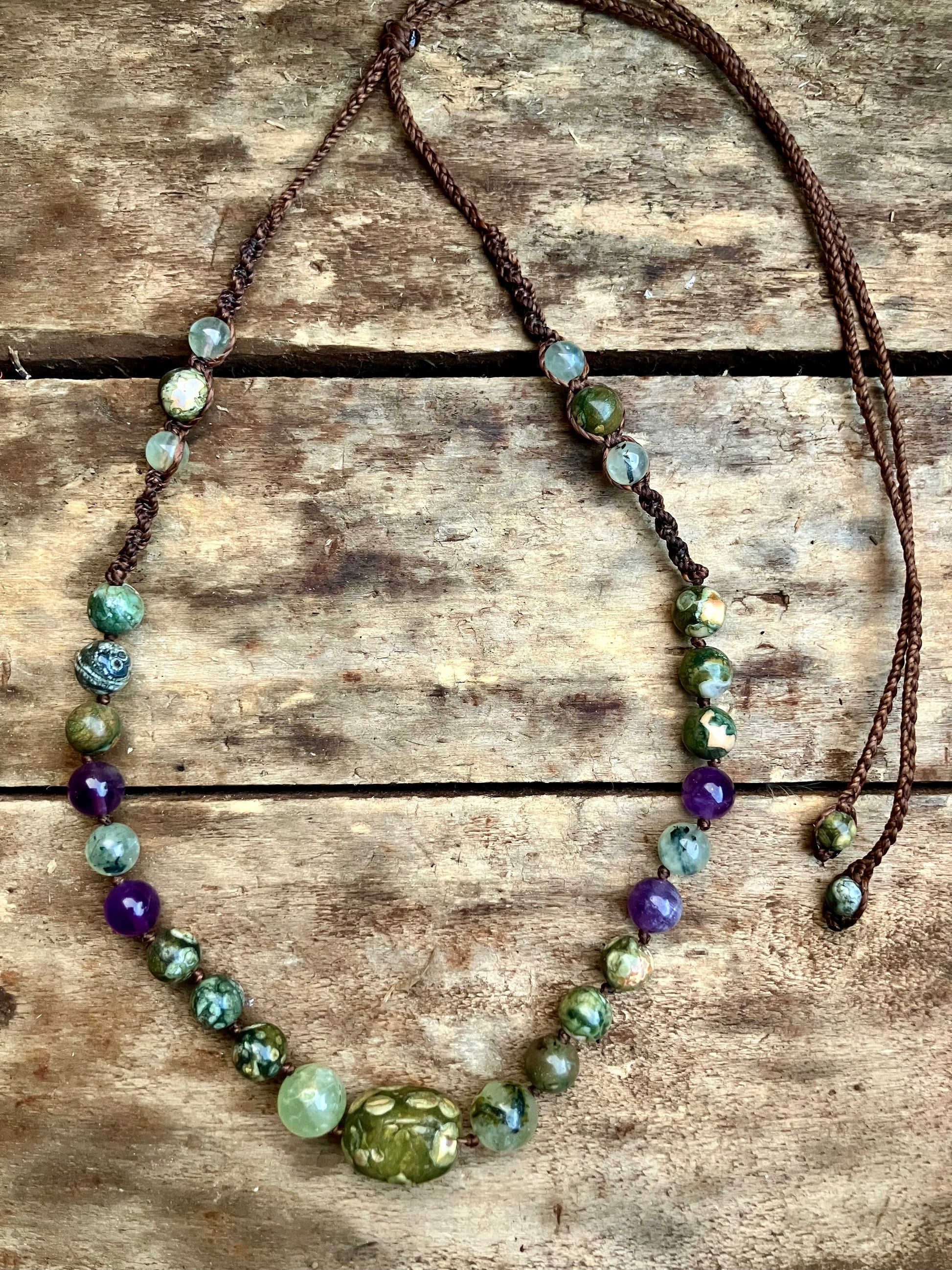 This earthy necklace is made with Rainforest Jasper vibrates with the rhythm of the earth this crystal promotes connection with nature, Prehnite clears away negative emotions, a stone of unconditional love and Amethyst a protection crystal that helps to deepen meditation and connection to the divine