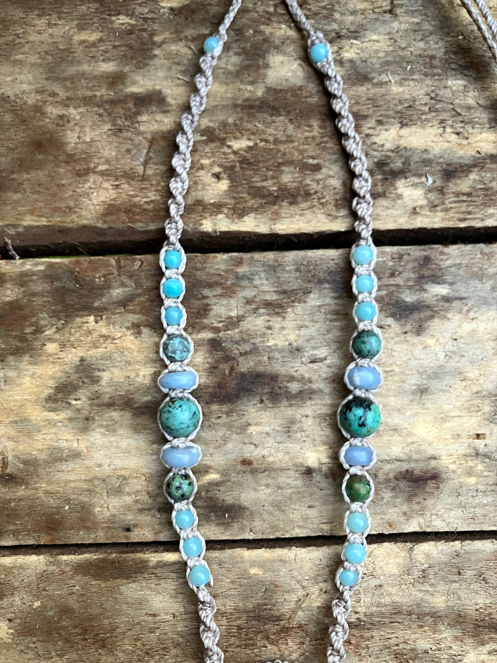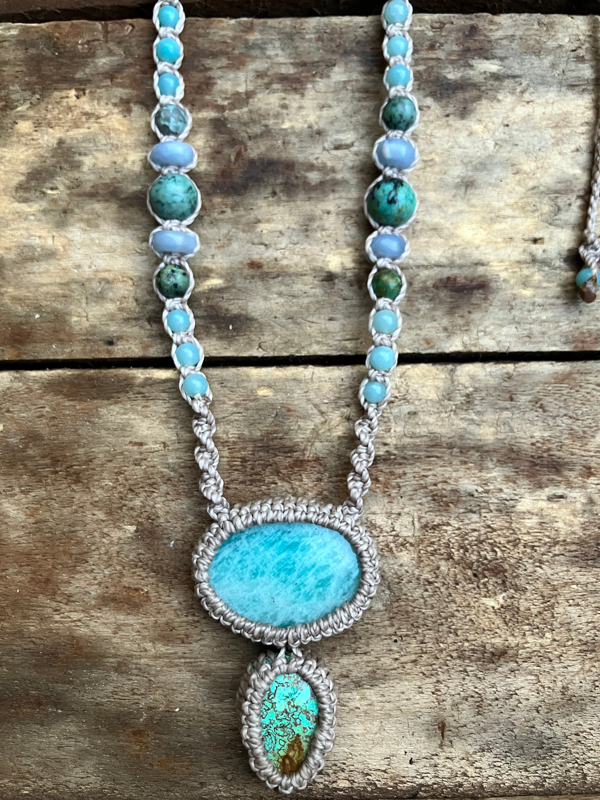 This sacred talisman has been woven to deepen your connection with your truth connected to the Throat Chakra woven with Amazonite a power stone of courage and communication Turquoise shields the spirit and strengthens your inner voice, and Angelite carries a soft celestial energy that connects you to higher guidance. Together, they create a harmonious field of peace, protection, and spiritual alignment—an everyday companion for walking your path with clarity and grace.