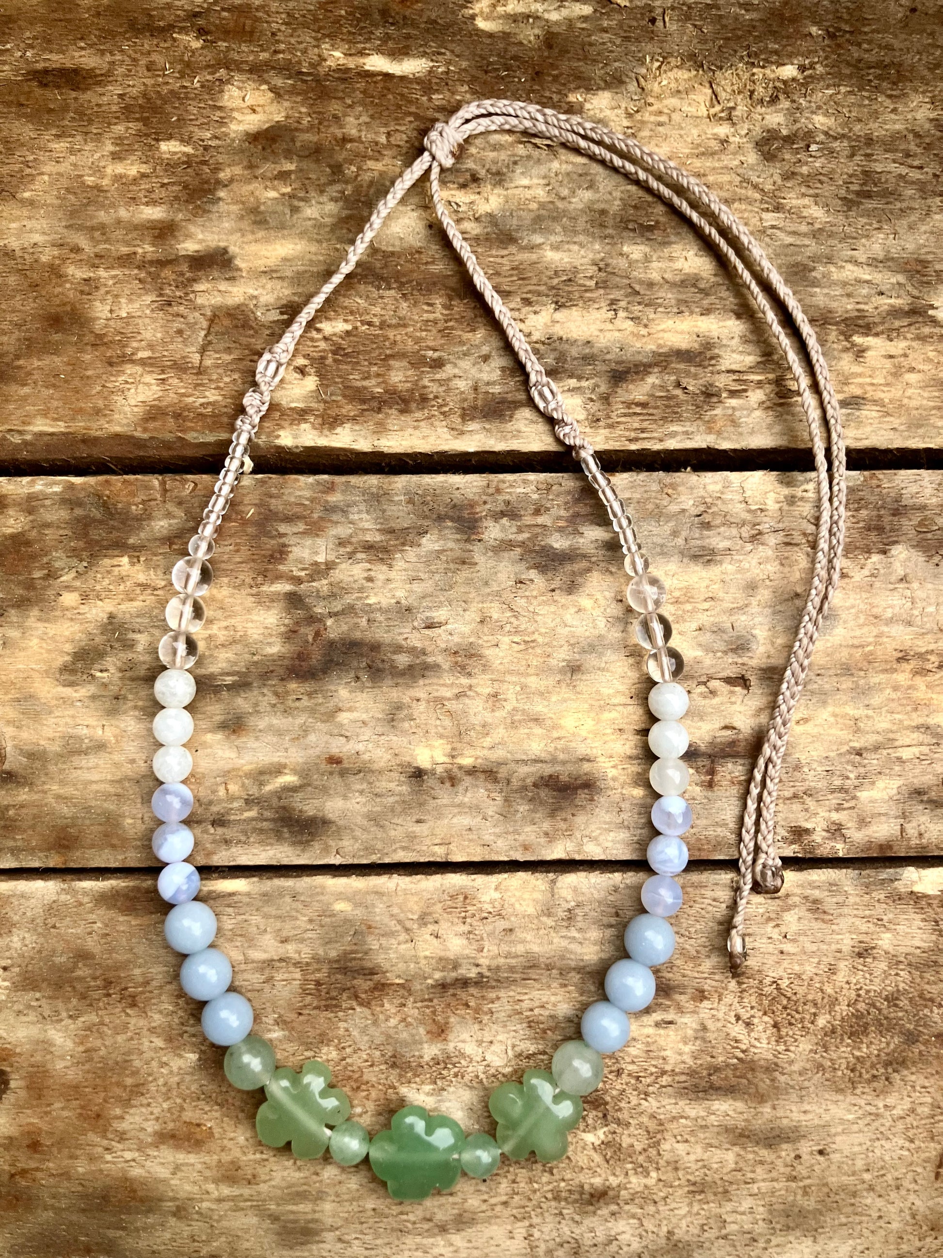 For some reason this necklace makes me think of clouds floating over a grassy field… made with Green Adventurine Crystal Flowers bringing joy & abundance paired with Angelite, Blue Lace Agate, Moonstone & Clear Quartz