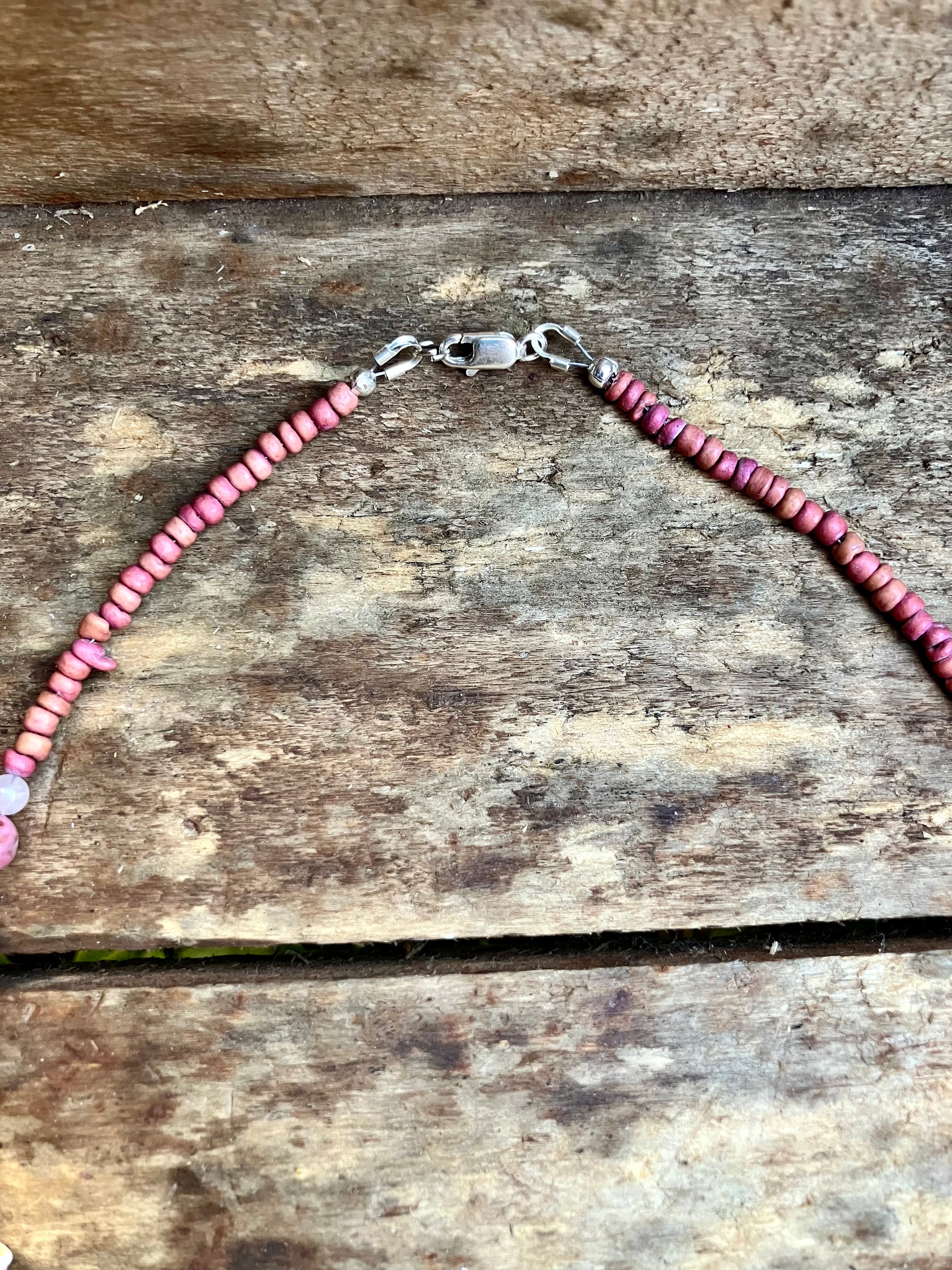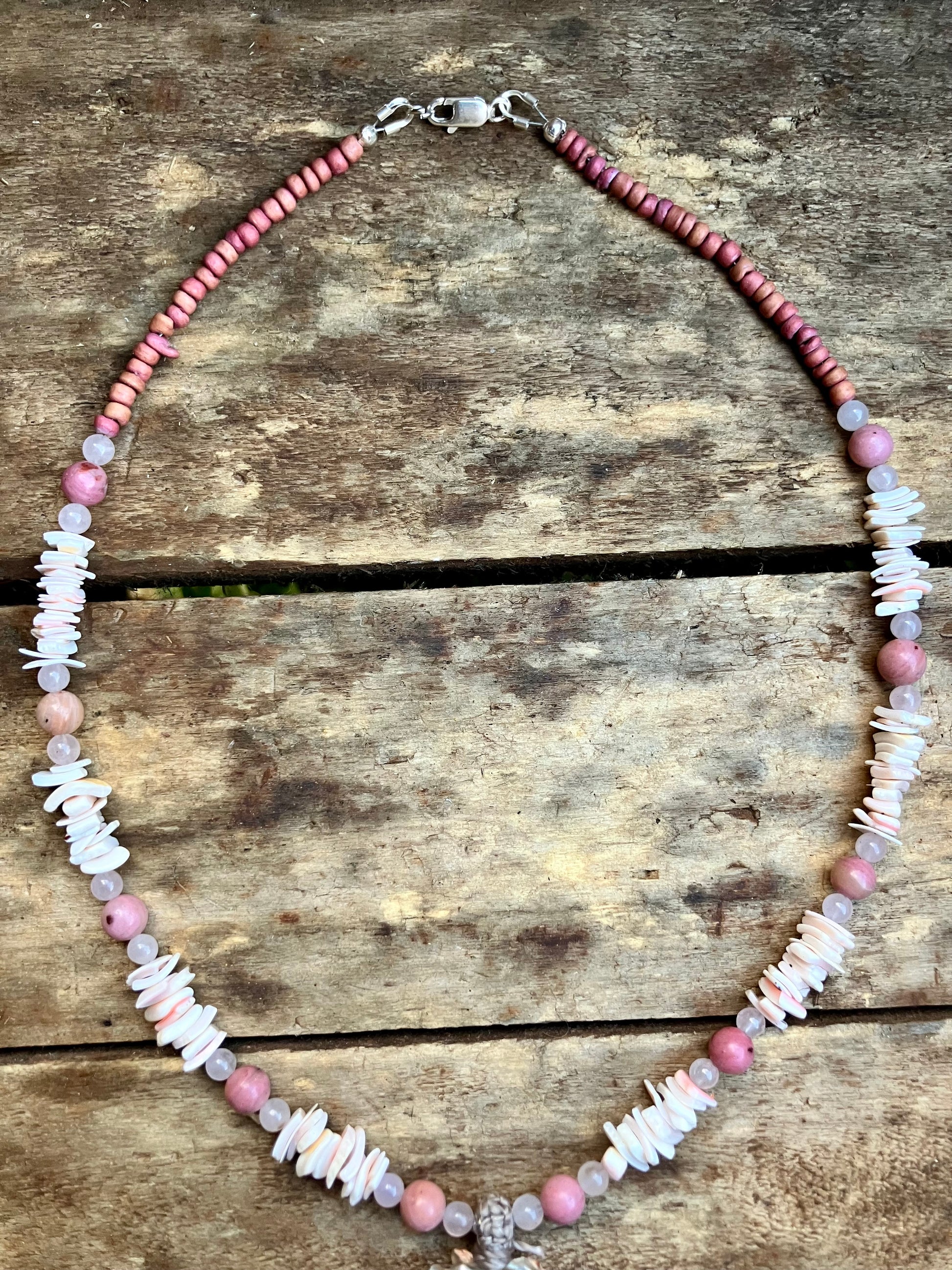 Mermaid Love, the depth of unconditional love. This stunning Abalone shell was found in Gracetown, WA. With vintage pink shell beads, Rose Quartz & Rhodonite both with gentle feminine energy, teaching compassion & forgiveness through unconditional love. This piece is one of a kind