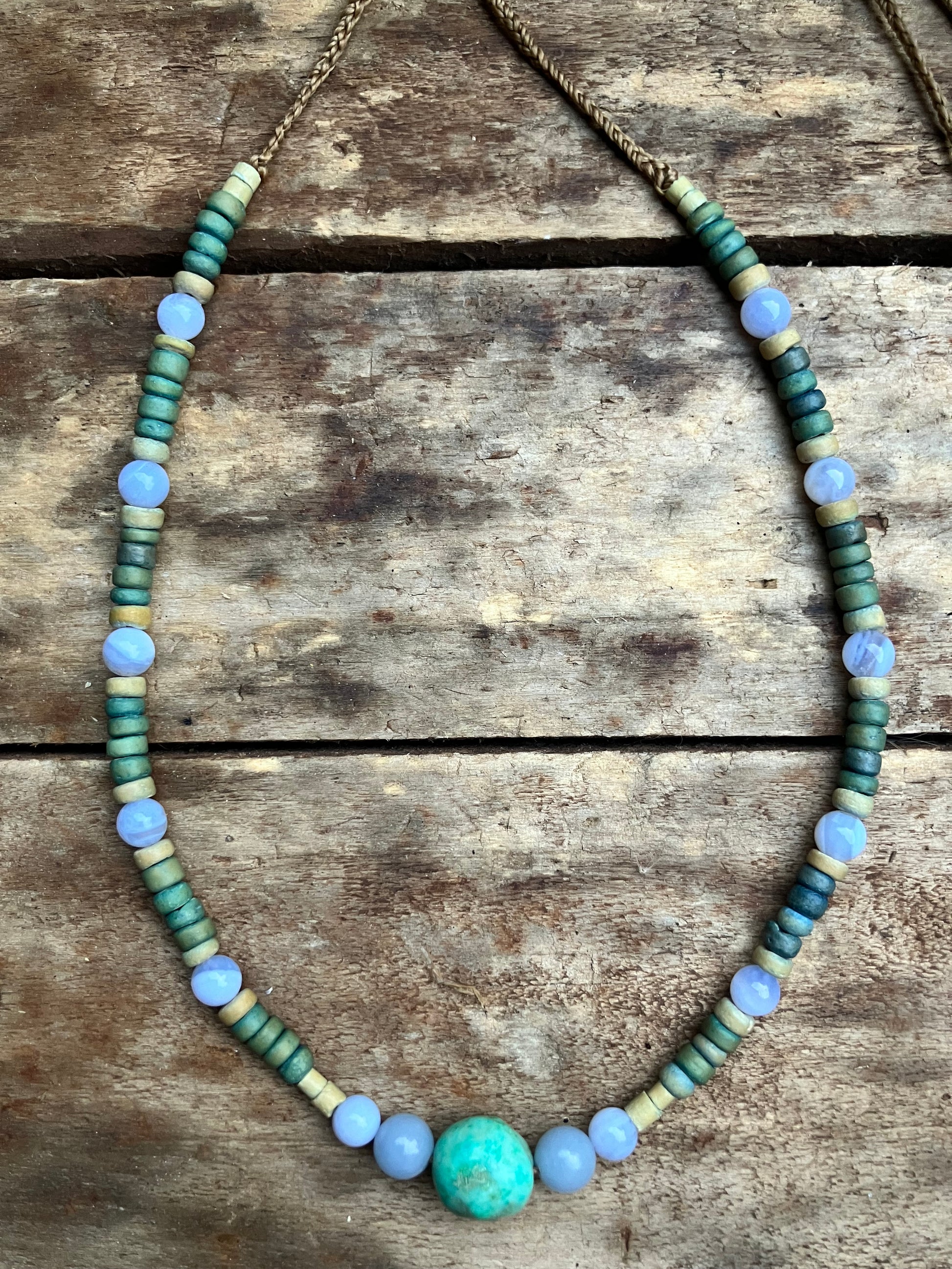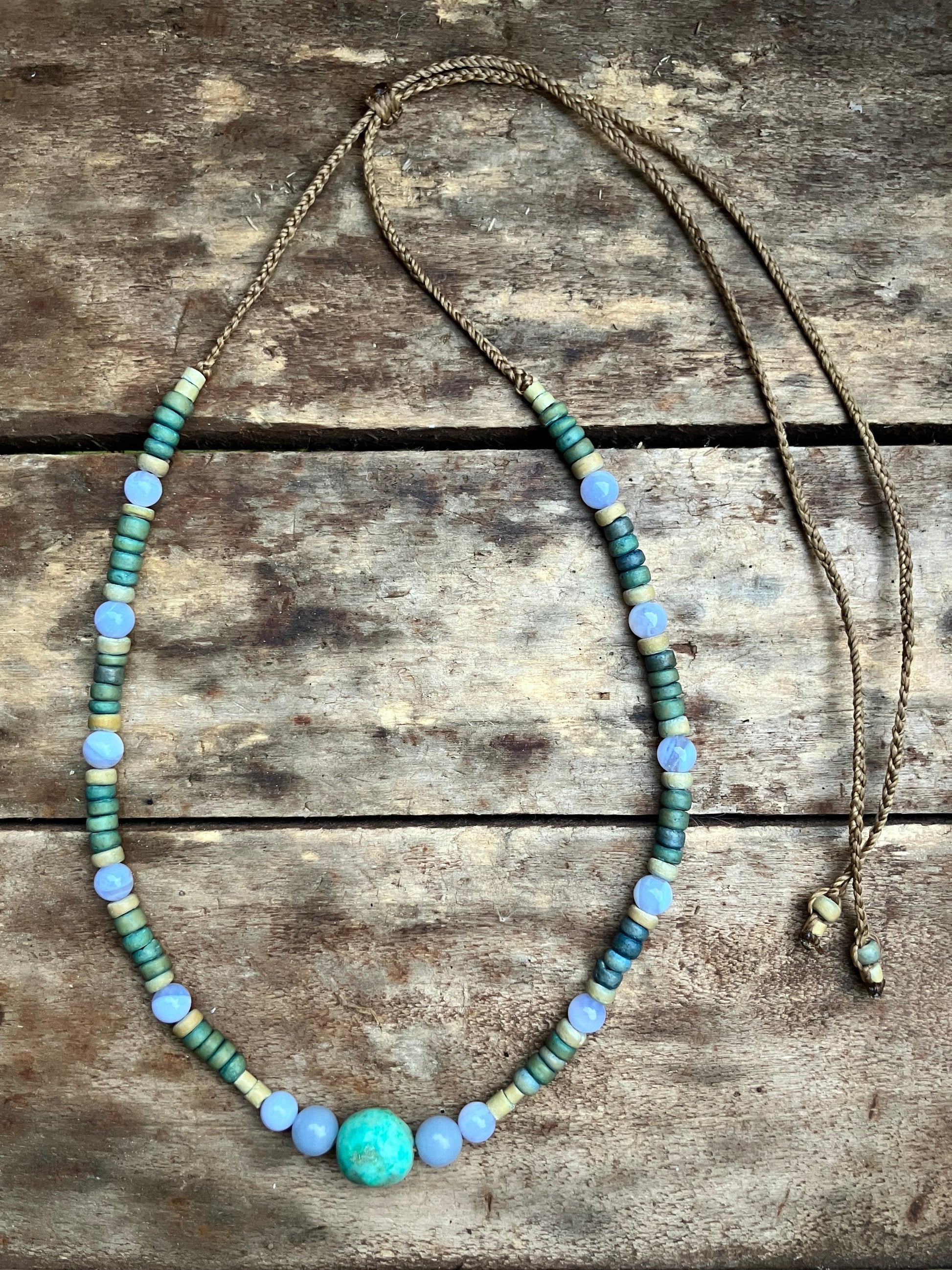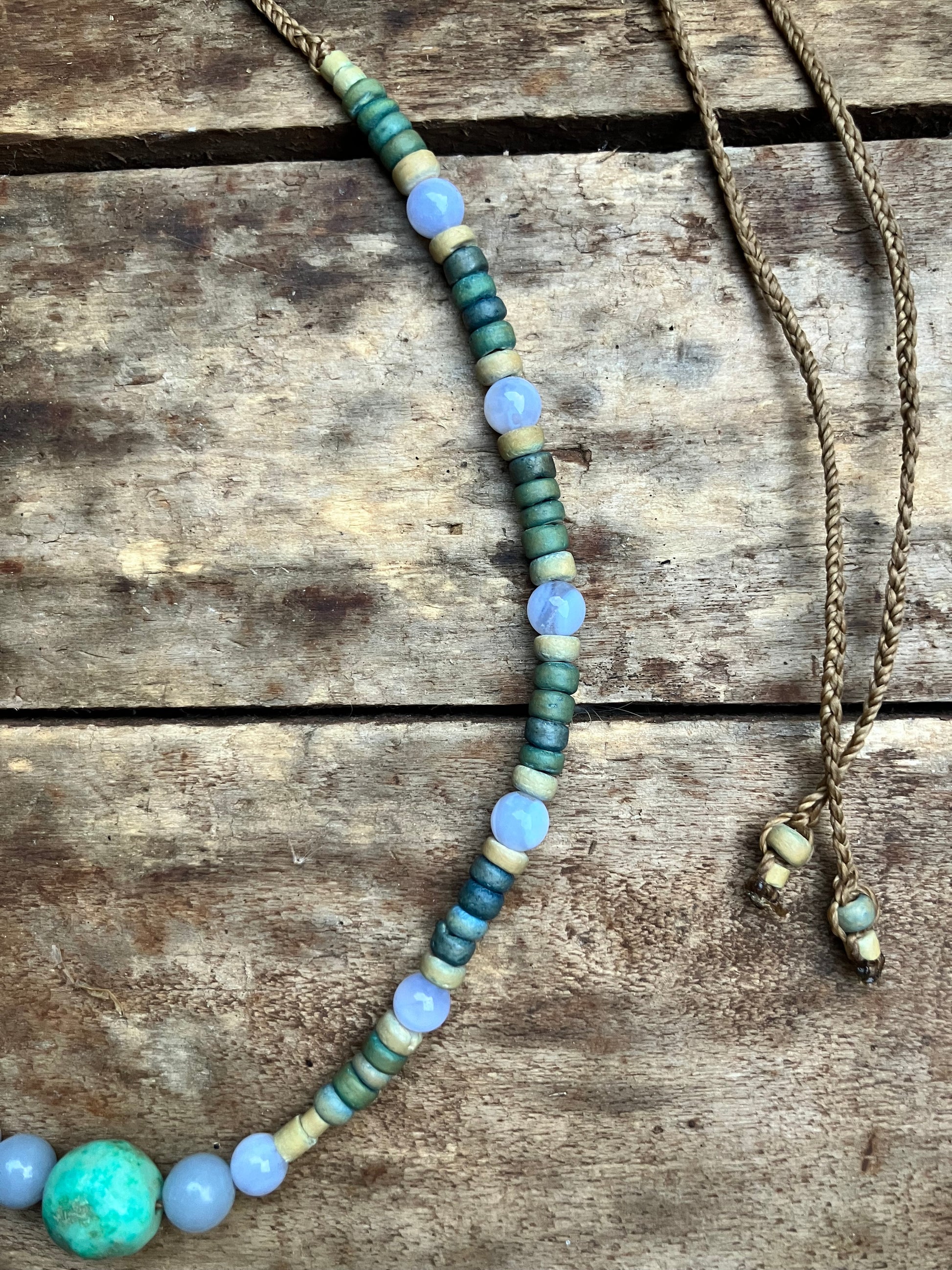 This strands of beads brings a sense of peace & calm. With a divine piece of Chrysocolla in the centre which is a stone of empowerment & communication with Blue Lace Agate a wonderful healing stone with a calming energy this crystal brings peace of mind & Angelite connects to multi-dimensional worlds, the angelic realm bringing healing from higher dimensions connecting with recycled wooden beads