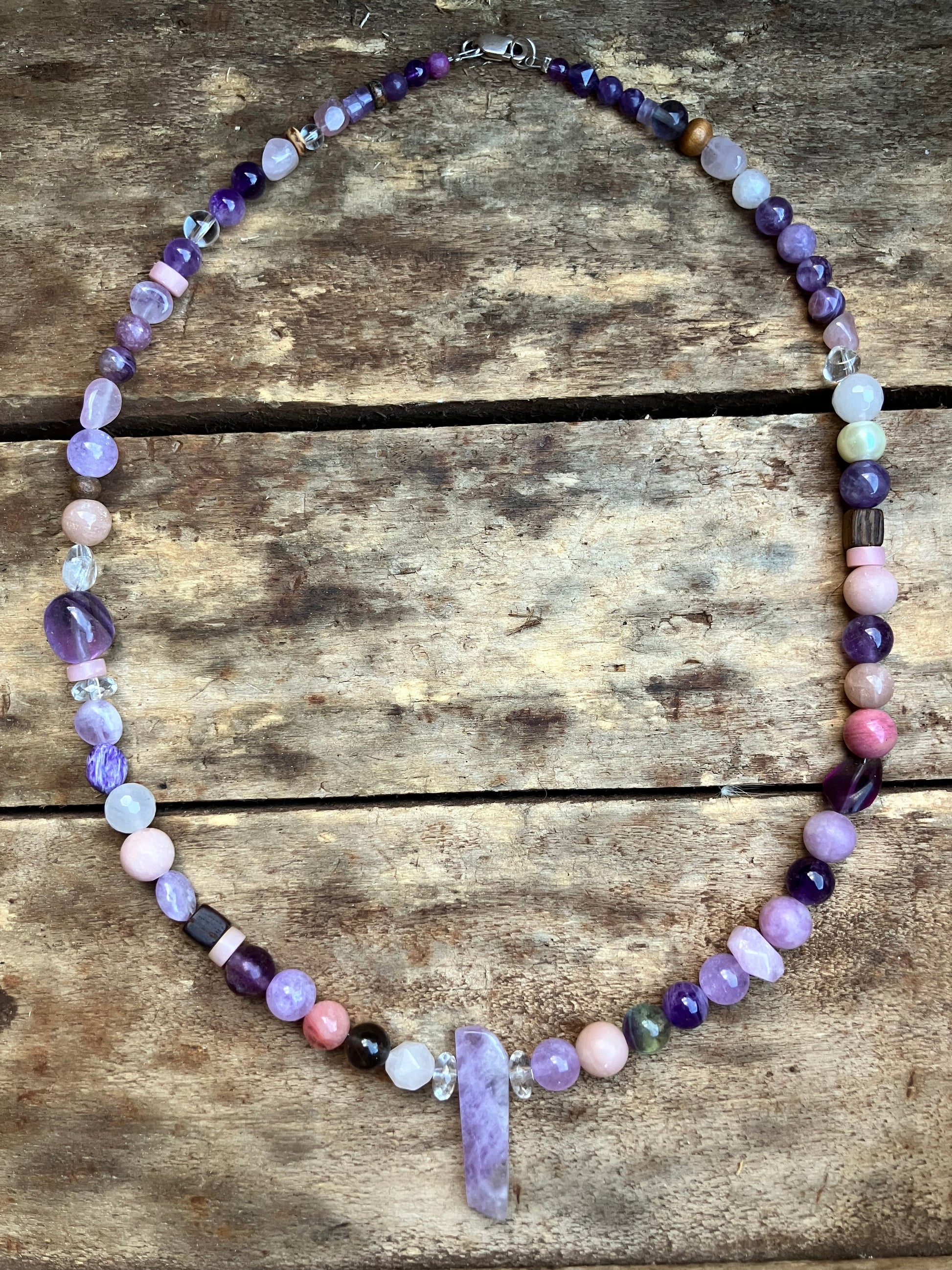 This stunning mixed beaded necklace is made with hues of purple to pink intuitively chosen to bring peace, unconditional love & a bit of faerie magic with a lavender amethyst tooth pendant