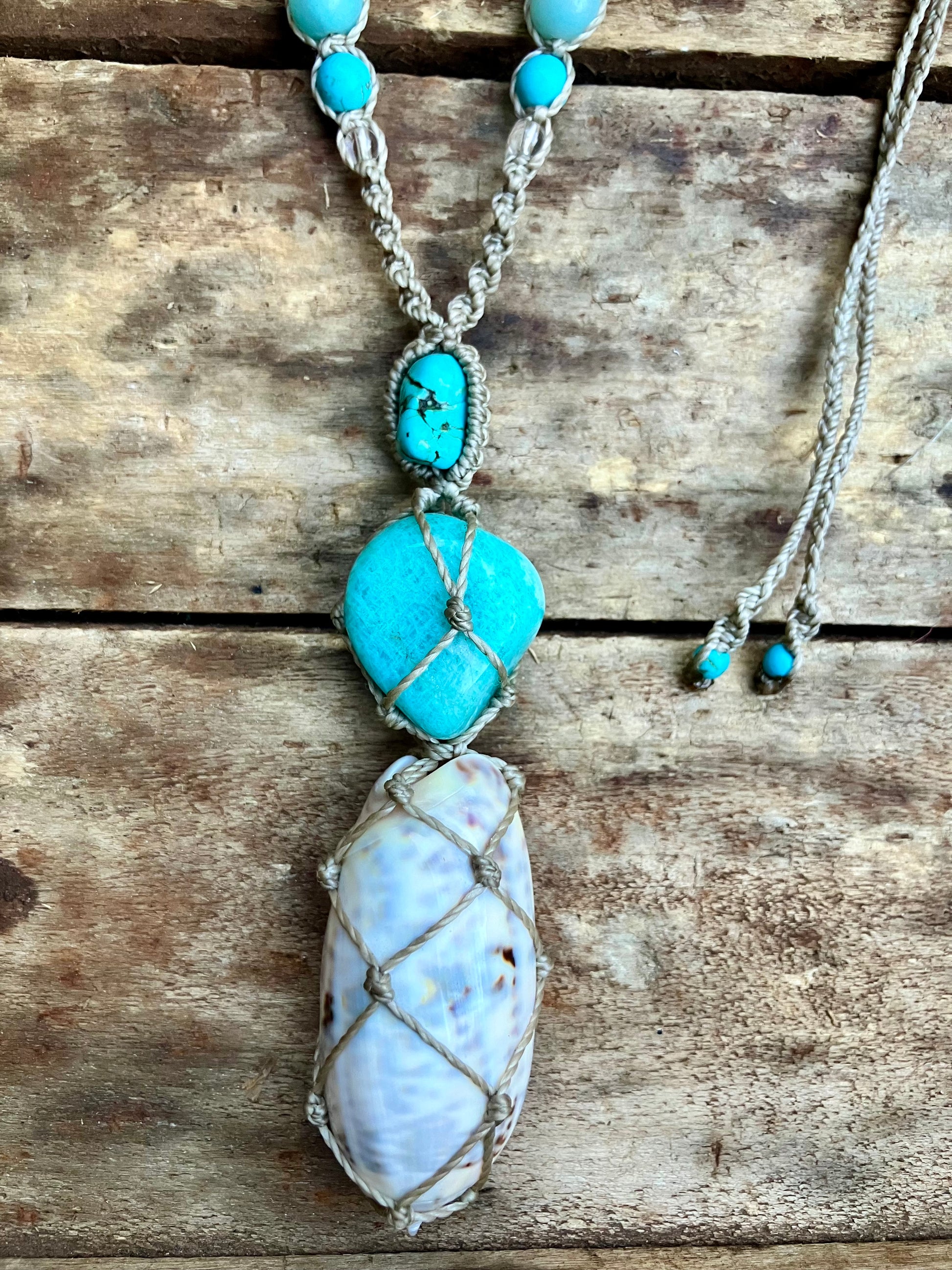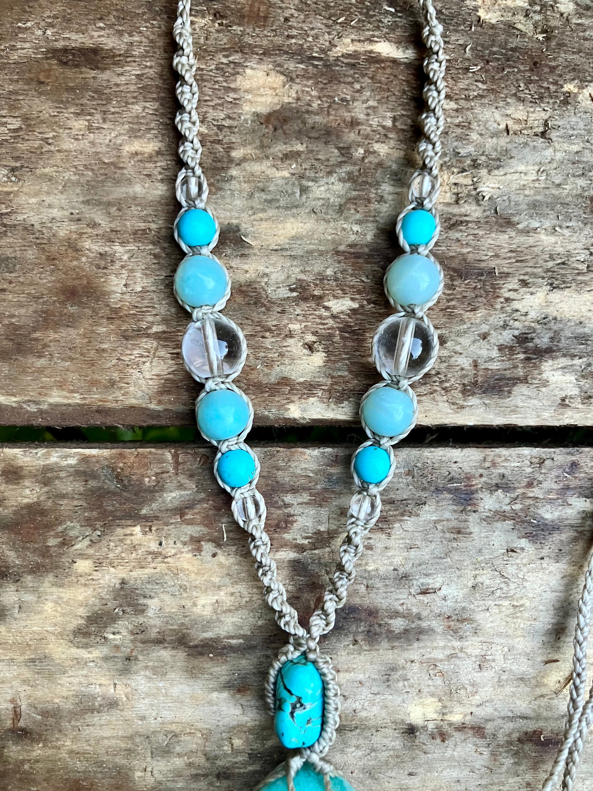 A beautiful ocean statement piece with a large shell found on the WA coastline… listen to it whisper secrets from the sea. Woven together with Amazonite Tumbled Crystal with Turquoise, Amazonite & Clear Quartz Beads. With an adjustable braided necklace this can be worn low on your stern or high on your chest