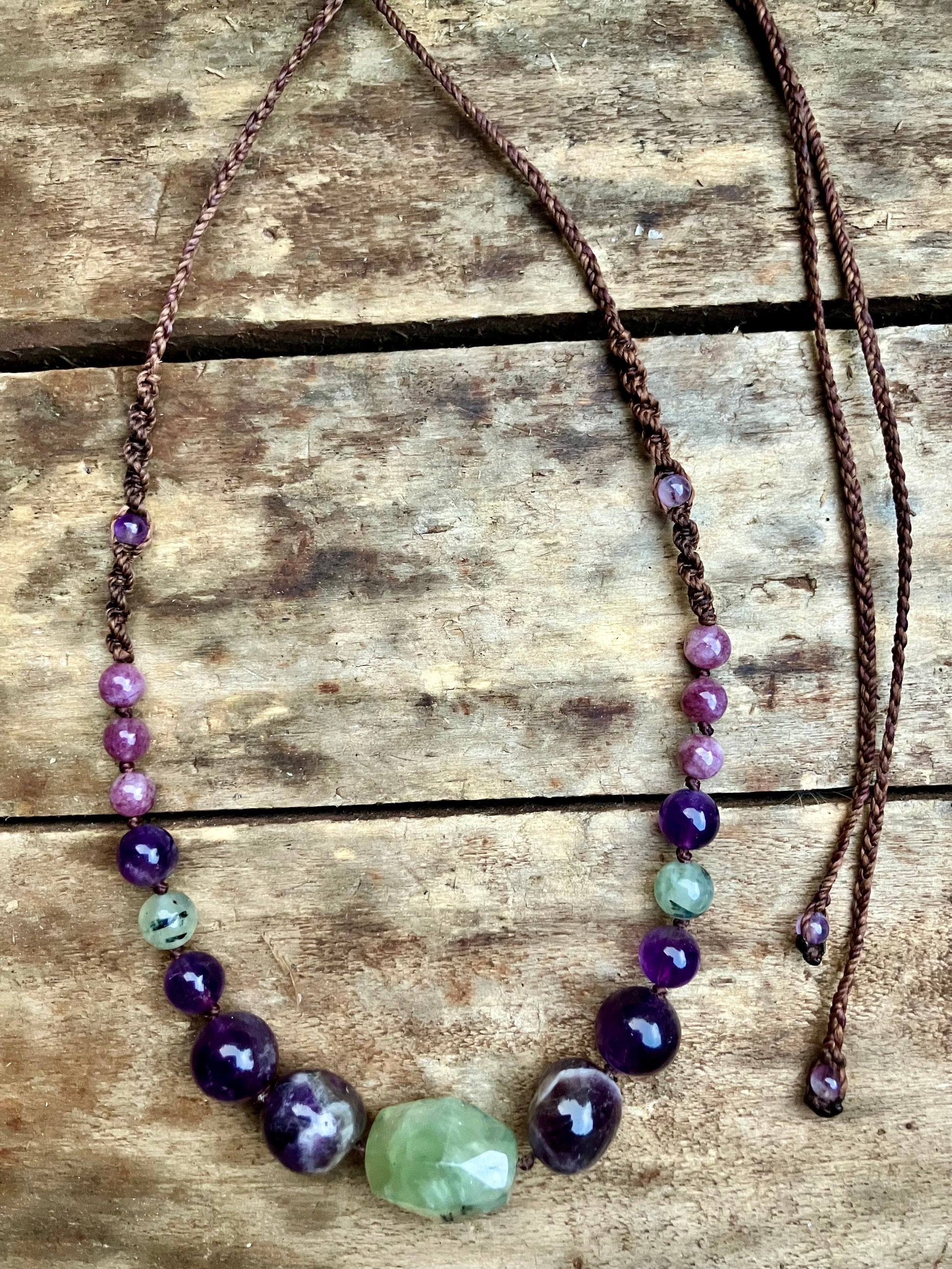 This chunky beaded necklace with knots between each bead made with Preunite a stone of unconditional love, Amethyst & Lepidolite