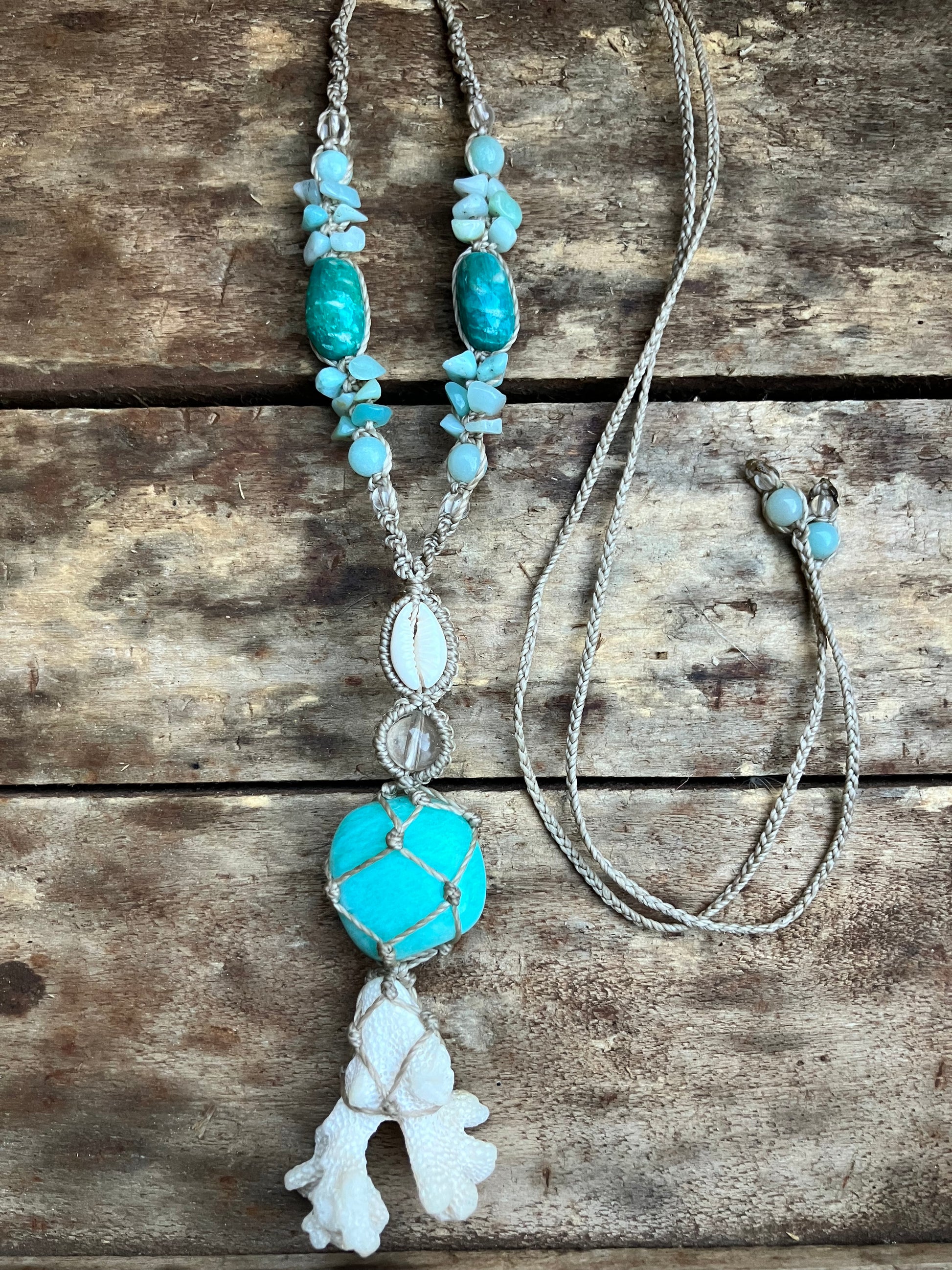 This incredible piece of coral was respectfully collected from the north west of WA, telling stories of the reef now washed upon the shore line. A true mermaid statement piece woven together with Amazonite, Clear Quartz & a cowrie shell. This necklace is one of kind